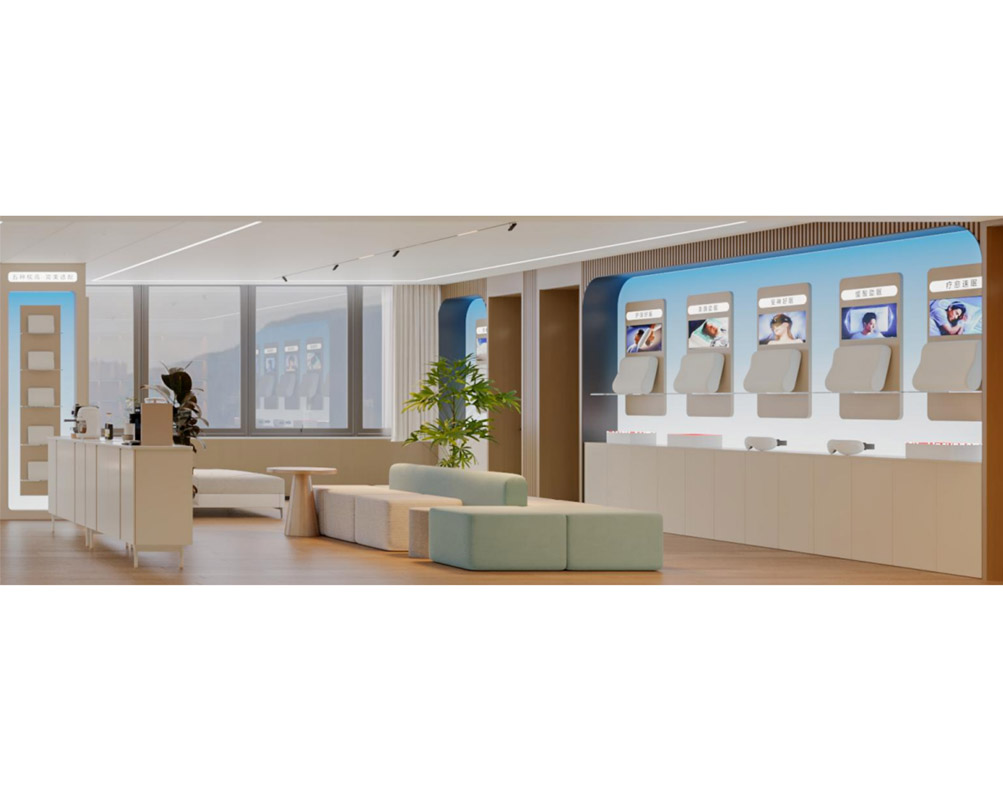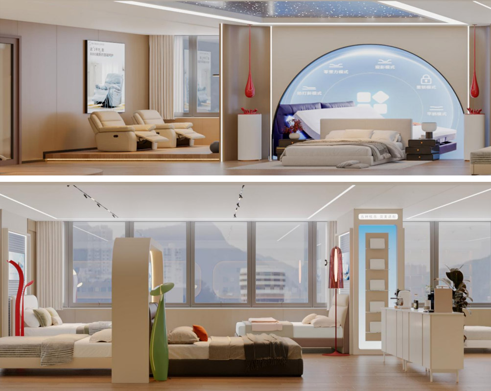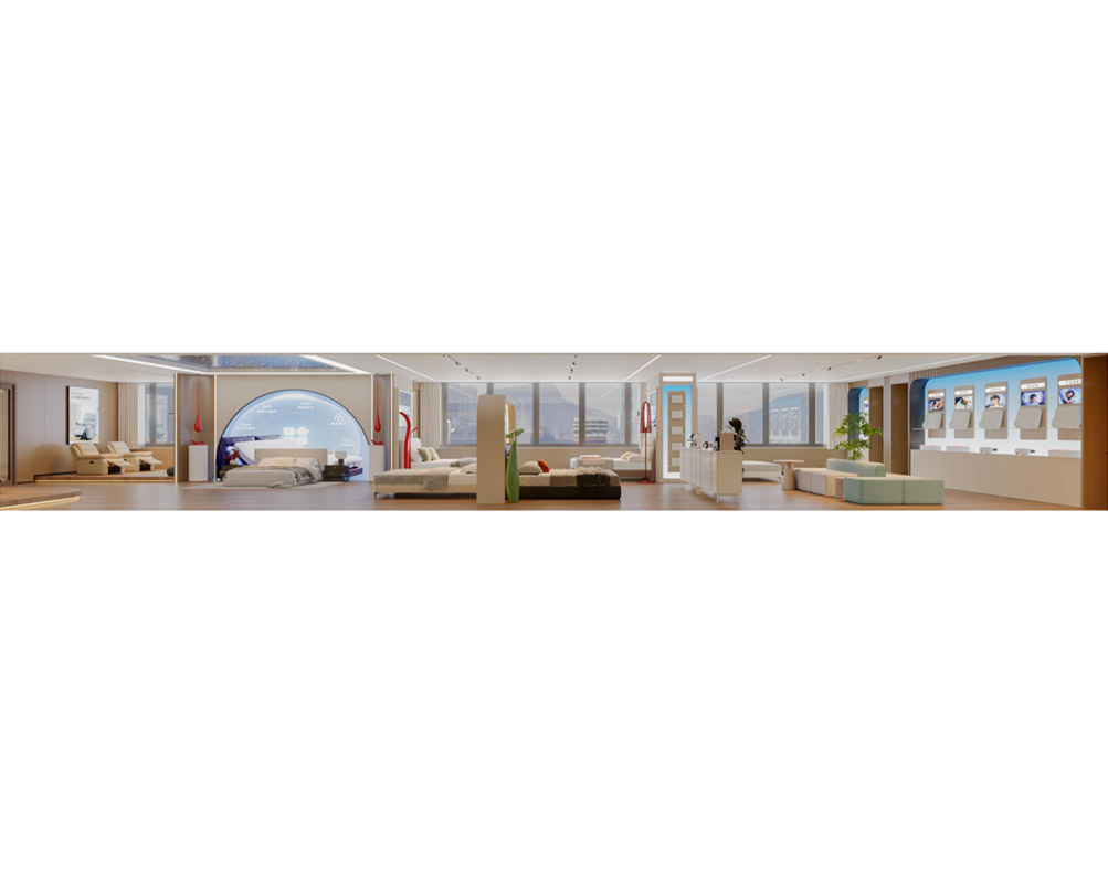 黄台家居广场内办公室软装设计,700 余平综合空间,集床垫专业展厅、办公区、会议室于一体,由专业团队统一软装设计。整体风格现代简约、动线流畅、功能齐全,兼顾展示形象、商务洽谈与日常办公需求,打造舒适、专业、有质感的一站式体验空间。