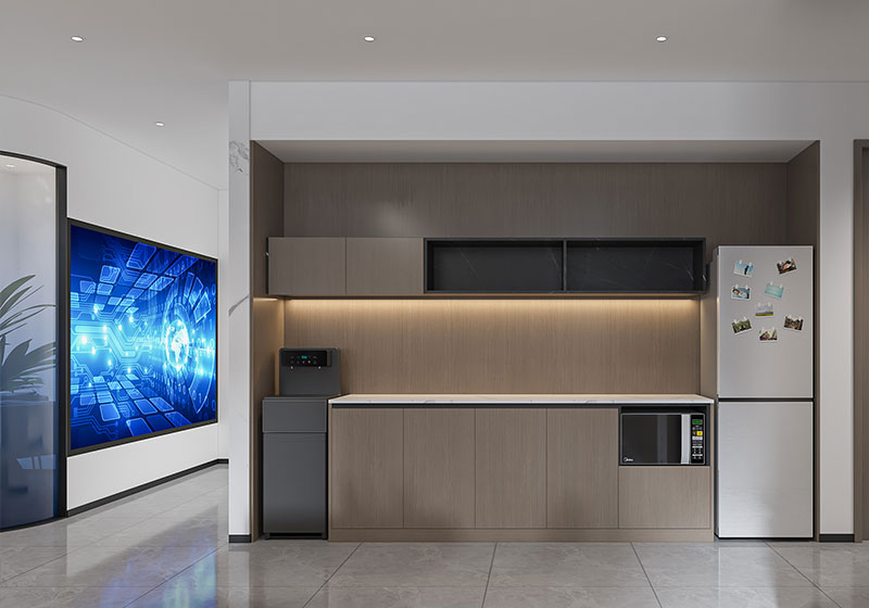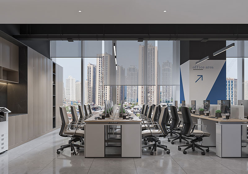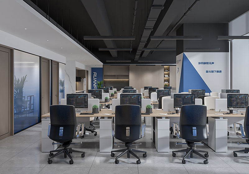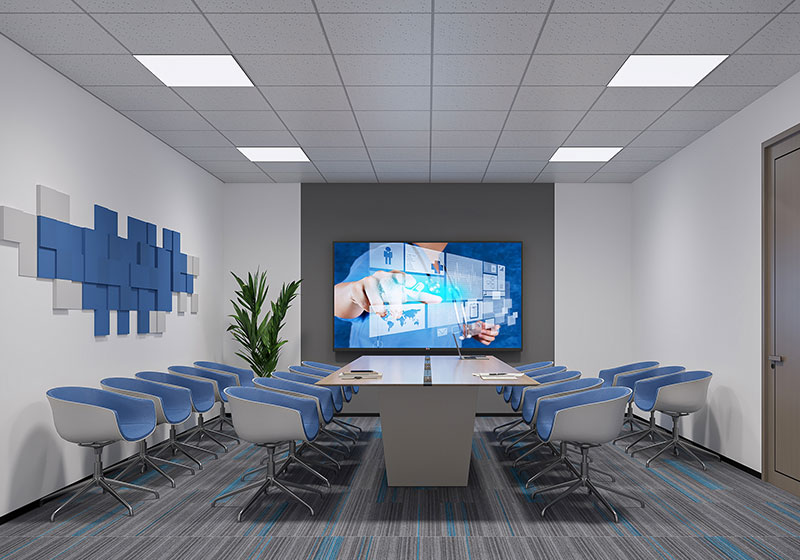 效果,以简约现代风格打造出高效商务空间:浅灰吊顶配嵌入式灯组,让会议室通透明亮;墙面采用白灰撞色设计,搭配蓝白几何装饰板,既呼应企业科技属性,又融入济南办公空间的简洁审美。
