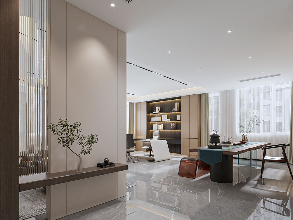 3、 实现传统古典与现代潮流的碰撞融合。比如,采用屏风作为隔断,清晰划分办公区域;通过镂空木门打造玄关柜,既保留中式韵味,又符合现代办公的空间利用需求